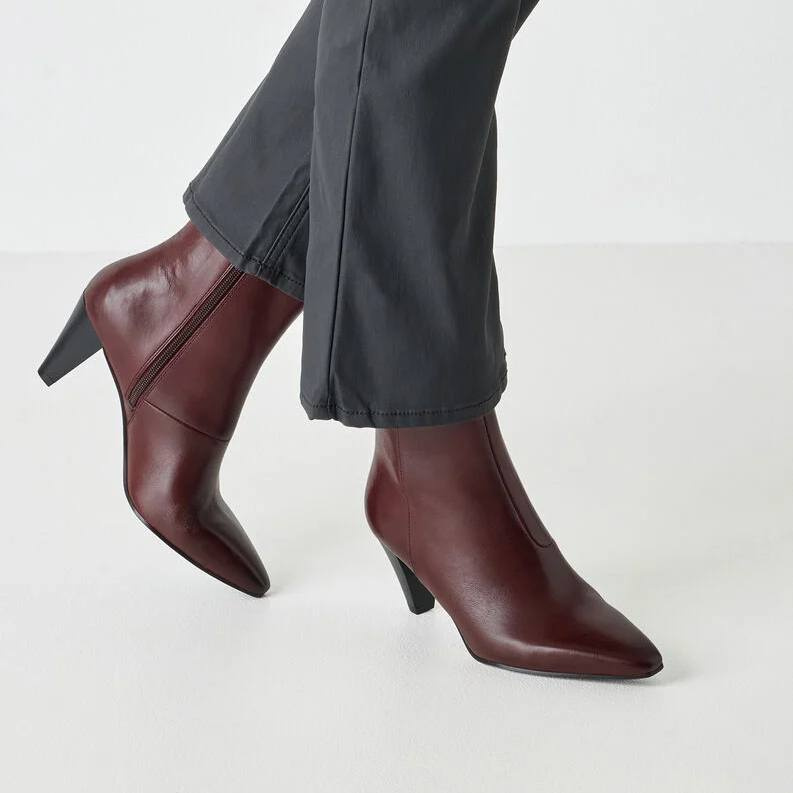 Элегантные ботильоны бордового цвета с зауженным мысом и клиновидным каблуком — базовая модель этого сезона. Благодаря многослойному голенищу эту комфортную пару можно легко сочетать как с узкими брюками, так и с платьями. Тёплый флисовый материал в подкладке добавляет уюта, а мягкая стелька Touch it адаптируется к форме стопы, уменьшая нагрузку при ходьбе.