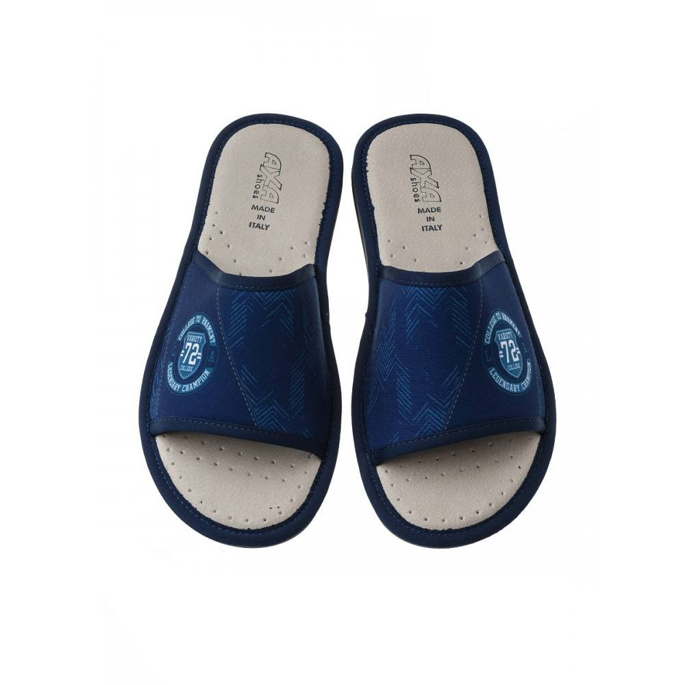 Мужские открытые домашние тапочки AXA shoes — это комфортная обувь для дома, в которой применены уникальные запатентованные технологии. Верх выполнен из хлопка высокого качества. Модель представлена в синем  цвете.