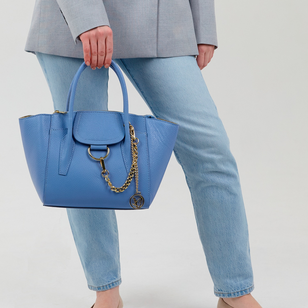 Сумка выполнена из качественной натуральной кожи модного небесно-голубого цвета и дополнена длинным ремнем, благодаря которому ее можно носить и через плечо, и в руке — как угодно!