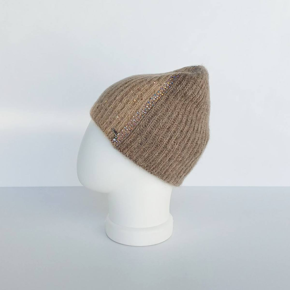 Двухцветная шапка со стразами SWAROVSKI и микро-пайетками - нарядный вариант для дам, которые не боятся привлечь внимание. Тёплая, мягкая и «дышащая» - благодаря высокому содержанию натуральных волокон. Прочная - благодаря включениям синтетических материалов.