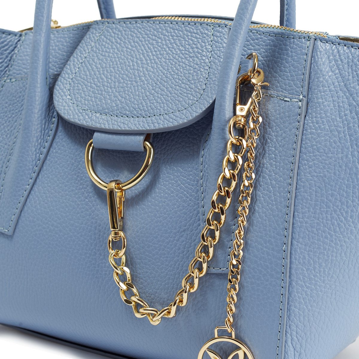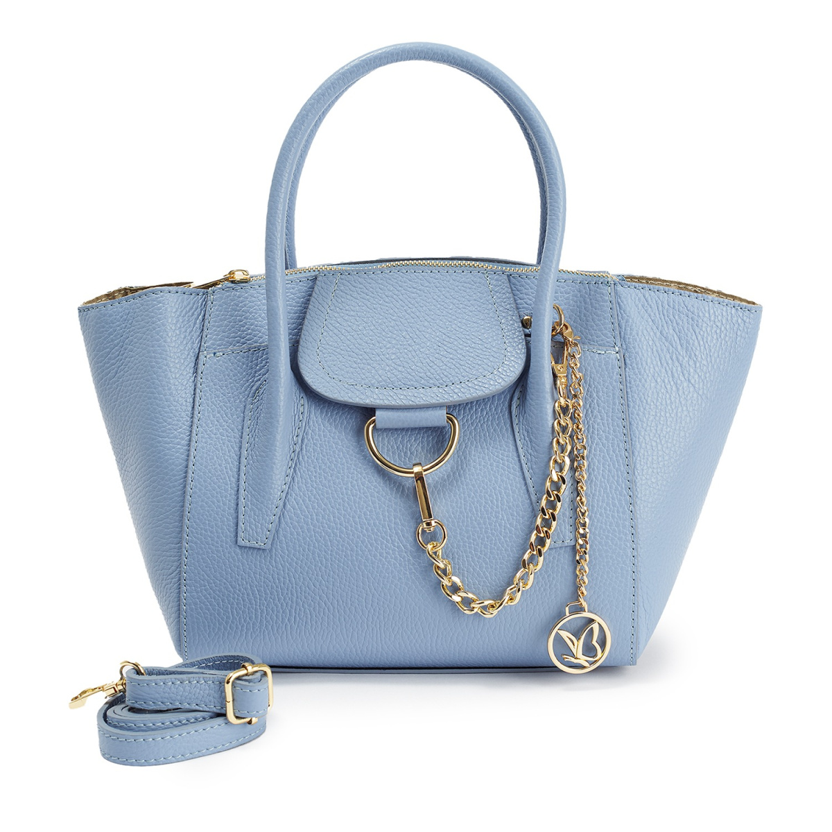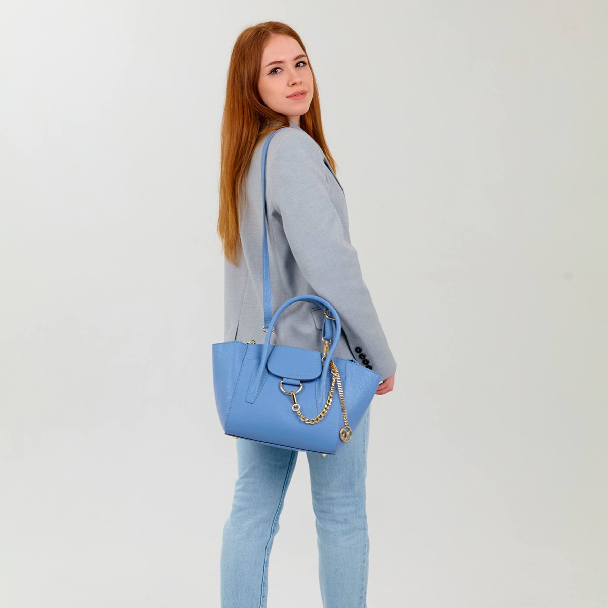 Сумка выполнена из качественной натуральной кожи модного небесно-голубого цвета и дополнена длинным ремнем, благодаря которому ее можно носить и через плечо, и в руке — как угодно!